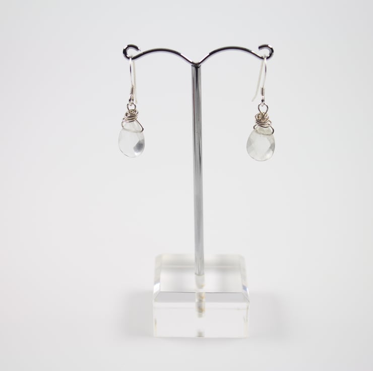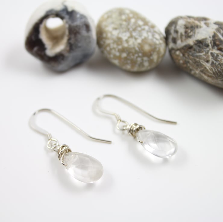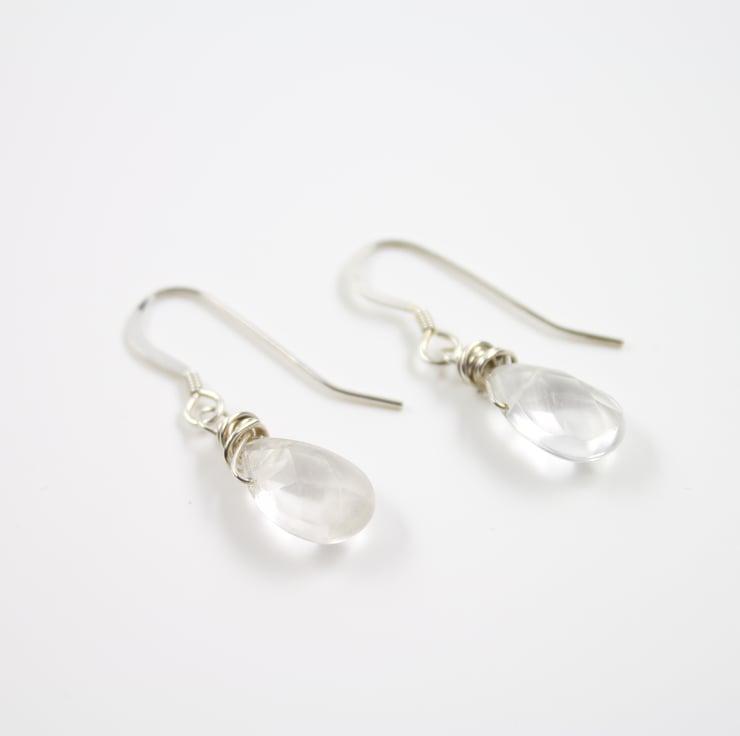 These pretty drop earrings have been handmade using faceted clear quartz briolette beads which have been wire wrapped with sterling silver on sterling silver ear wires.