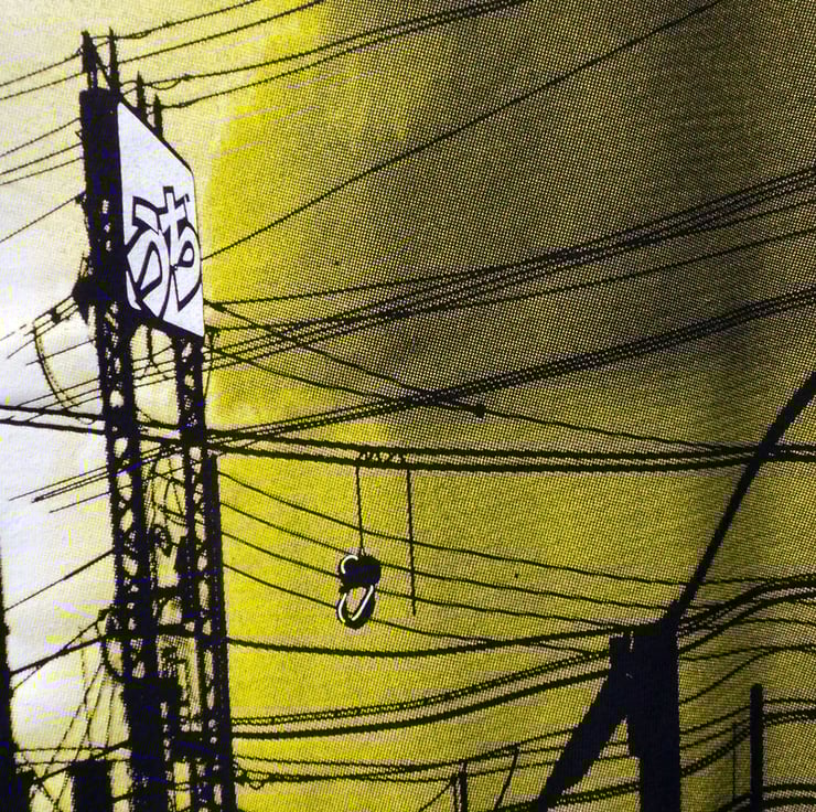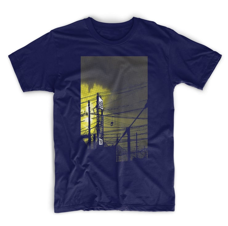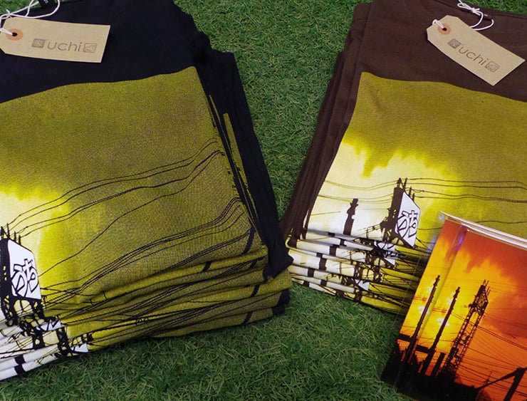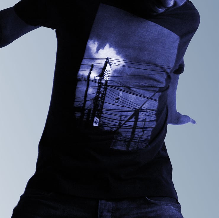 This image is made from a sunset photograph I took one evening in Kyoto. I squashed the image to get a more urban look, added the headphones and the uchi kanji and uchi hiragana logos. This is one of my favourite T shirts because of the struggle to get small enough halftone dots to print without losing detail and that could register correctly with two colours. I like this T so much I made a short video and blog about it - http://uchi.co.uk/blog/screen-printing-uchi-sunset-t-shirt/