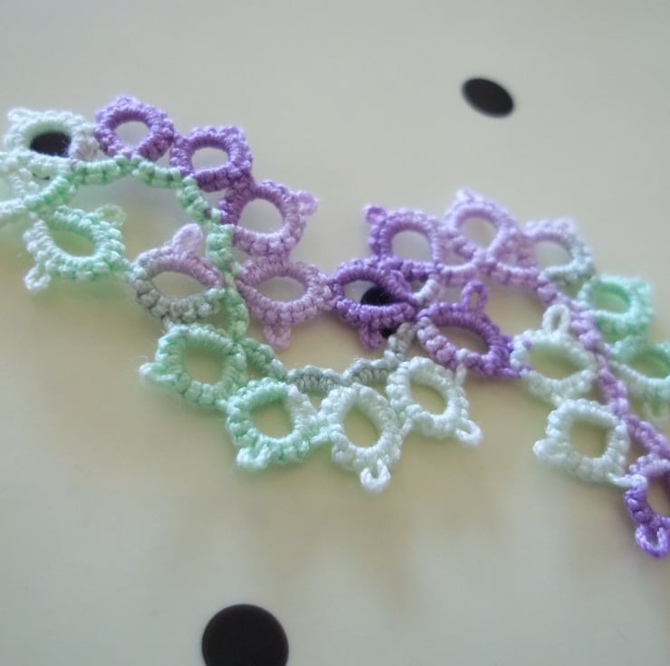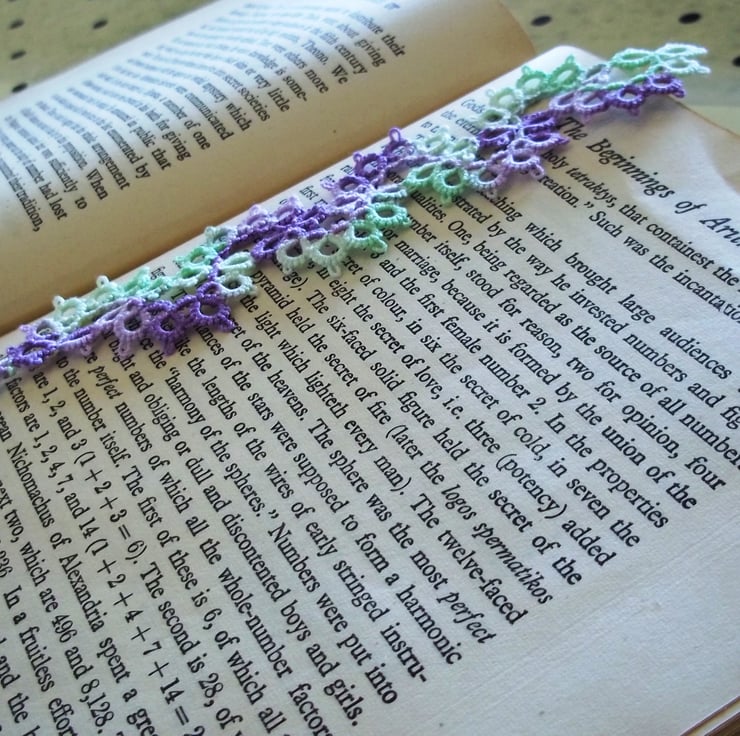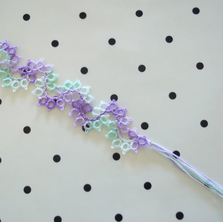 Tatting is an intricate form of knotted lace made with a small shuttle. Here a rippling design has been created with intricate loops and rings making this a pleasing item to keep place in your favourite read. Perfect as a gift or treat for yourself. The cotton used is variegated meaning that no two items created will be exactly the same. This pattern has been designed by the maker. The bookmark is finished off with multi stranded loose cotton tail. Approximate measurements are eight inches long (20cm) including tail by one inch (2.5cm) wide. Bookmark with come presented on a card backing wrapped in clear cellophane.