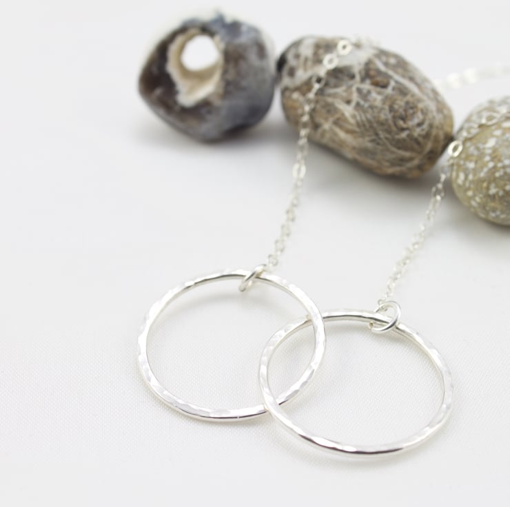 This necklace has been handmade using sterling silver wire which has been formed into two circles and linked together. The circles have been textured using a hammer to catch the light and hang from a 16"/40cm fine sterling silver trace chain.