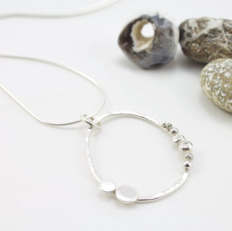 This pendant was made using sterling silver wire which I formed into an irregular circle and textured with a hammer to reflect the light. The planets were formed by melting silver into little nuggets which I then soldered onto one side of the pendant. The sun and moon were cut out from silver sheet and soldered onto the other side of the circle.
