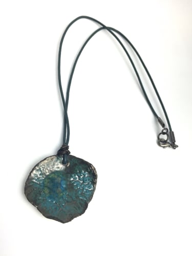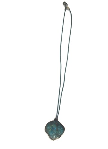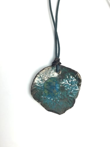 The porcelain disc measures 3.2x3.5cm and hangs from a teal leather cord 44cm in length.