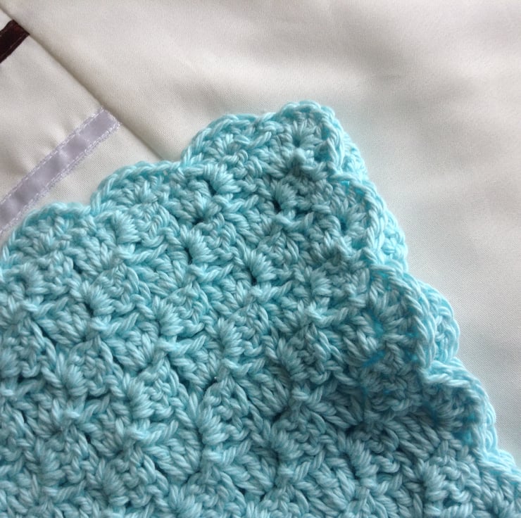 This blanket has been handmade using the crochet corner to corner pattern edged with a pretty scallop pattern, Suitable present for babies of either sex.