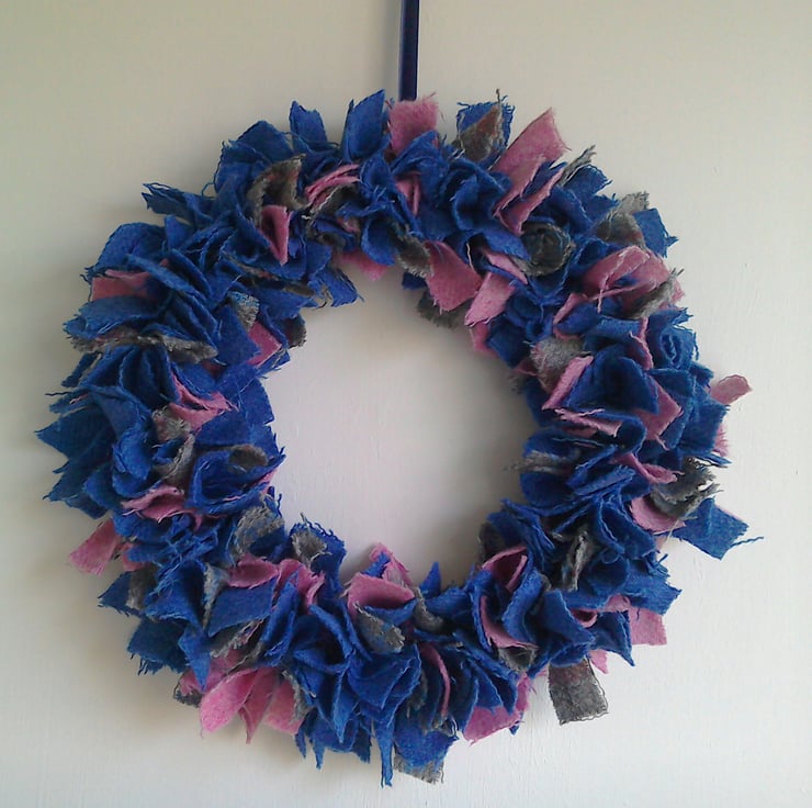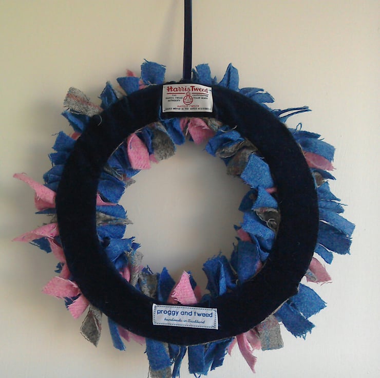 There are three Harris Tweeds in this lovely wreath. One tweed is a grey plaid with blue and pink, one is a plain pink twill the other a twill in a gorgeous shade of blue. The wreath is backed with navy velvet and comes with a navy velvet ribbon loop hanger.