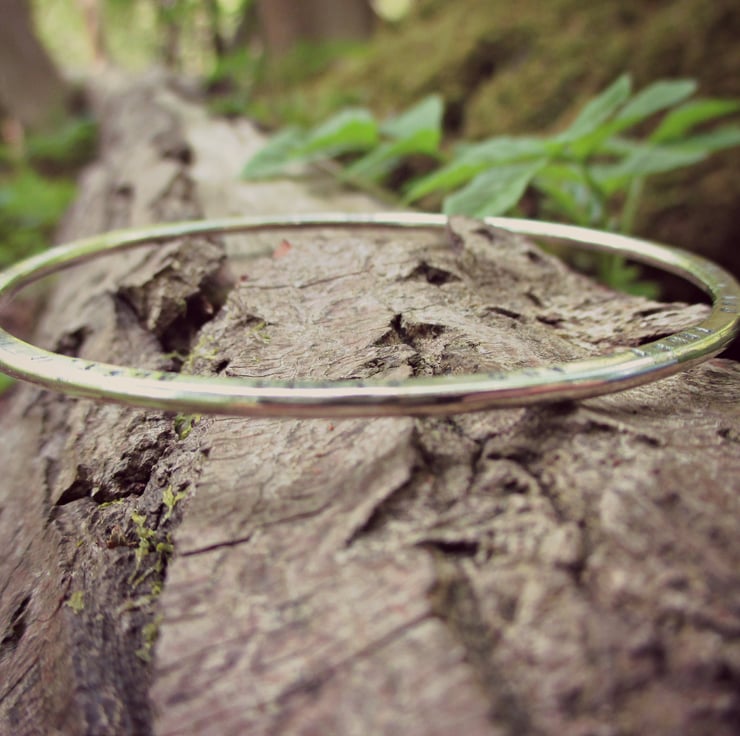 The round bangle is squashed flat until a thickness of around 2mm. It's a nice and slinky (but sturdy) piece - PERFECT for stacking.