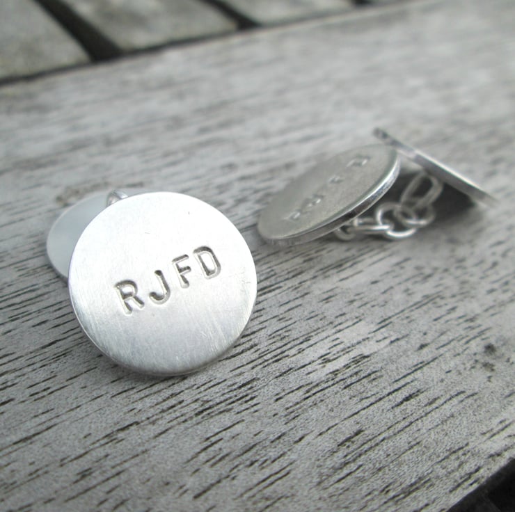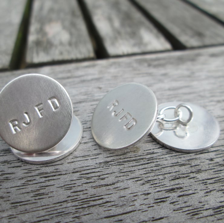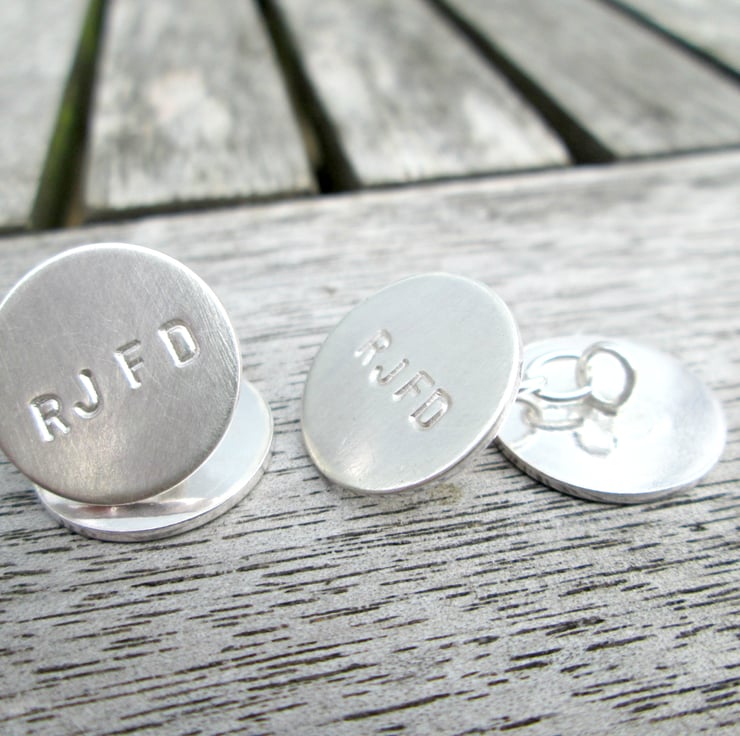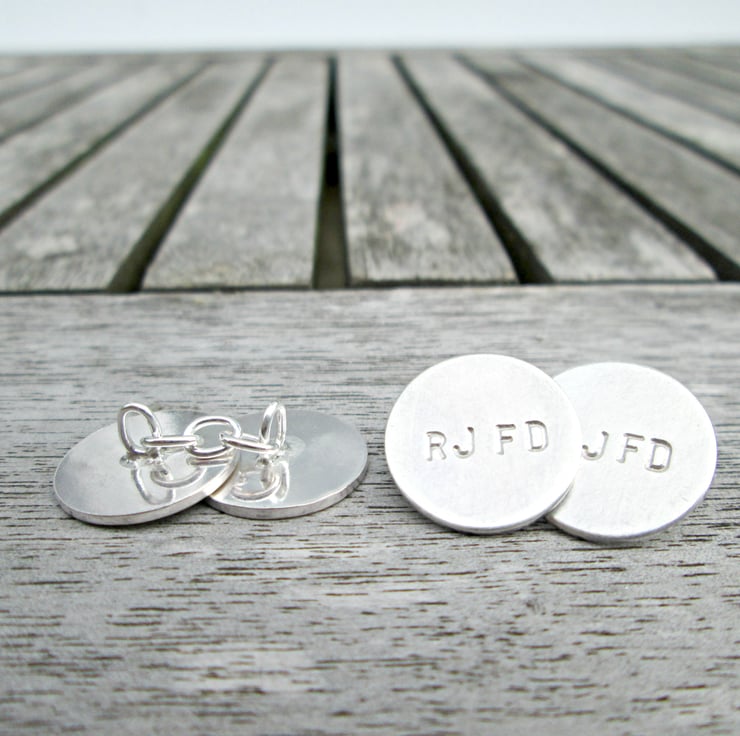 Each disc measures approx 15mm in diameter, has room for up to 4 initials, and is treated with a brushed satin finish. The initials are left silver to create a subtle elegance.