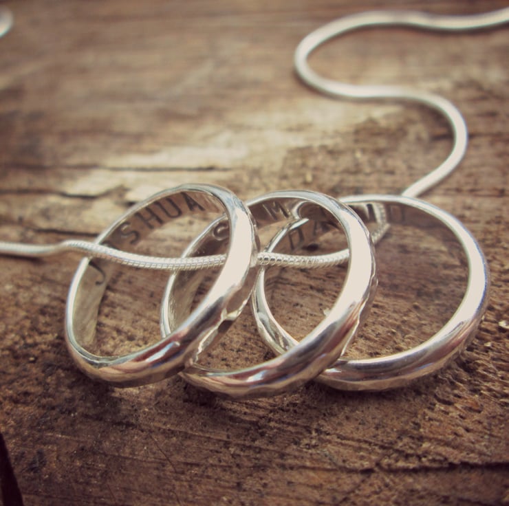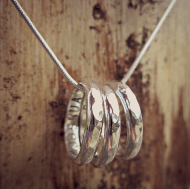 Each little Sterling Silver ring is hand stamped letter-by-letter on the inside with your chosen word, name or date. You can choose the amount of rings to suit you and your life. The 18" Sterling Silver chain is 'snake' style...nice and fluid, falling over the curves around your neck.
