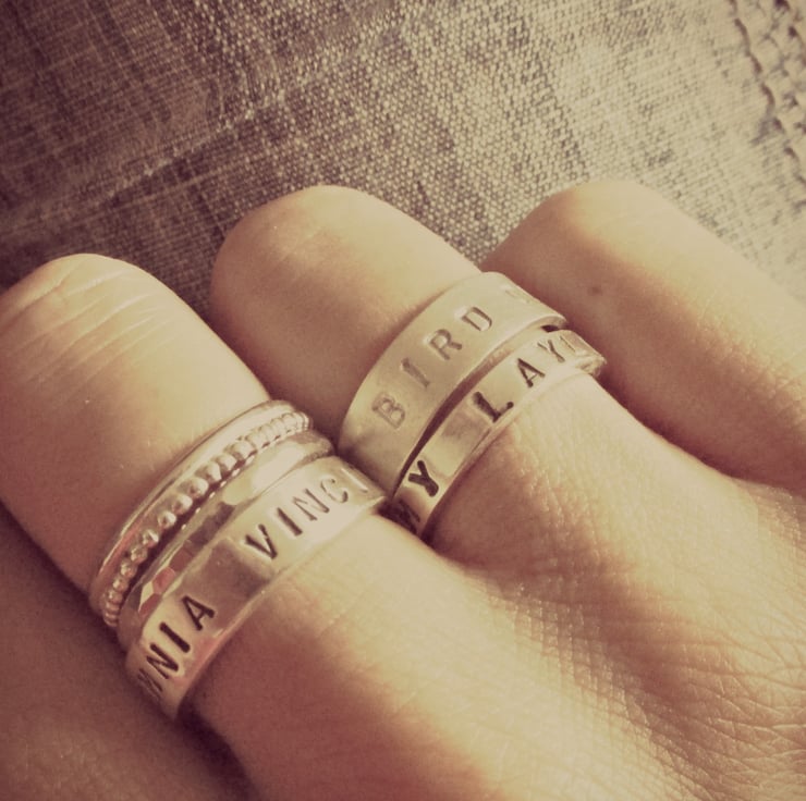 A sleek, smooth, and brushed matte Silver band with your desired name, word, date, or lyrics hand stamped for you on the inside. Or the outside. It's up to you!
