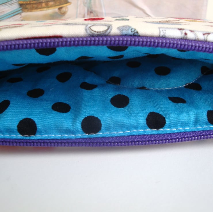 Made in a lovely printed cotton fabric ( interfaced ) , and a purple zip across the top . Case has a flat bottom .