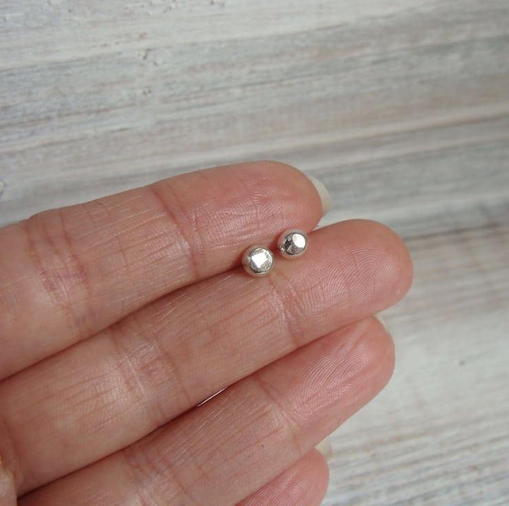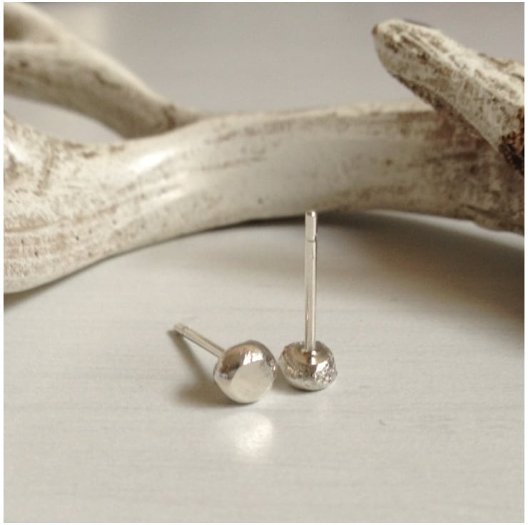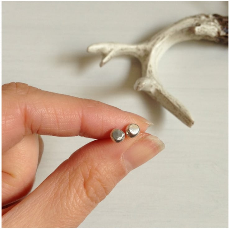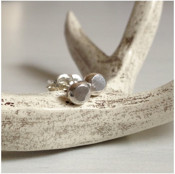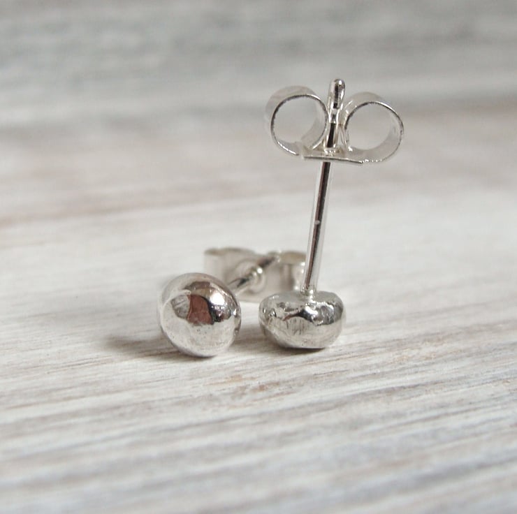 Perfect for everyday wear, these little pebbles are made from recycled molten sterling silver, lightly beaten and soldered onto earring posts.
