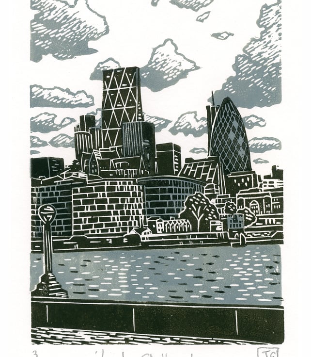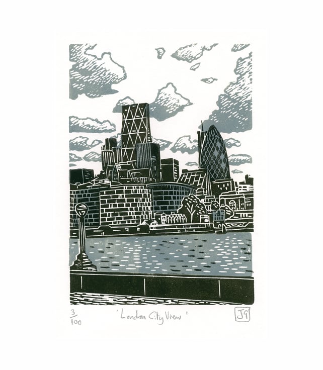 A hand-pressed 2-colour linocut print entitled 'London City View'.