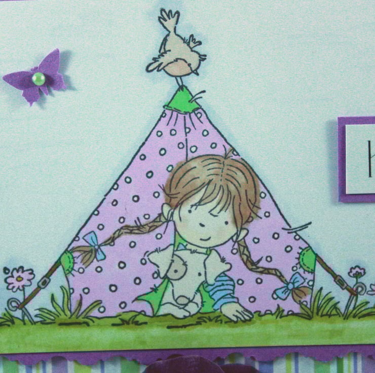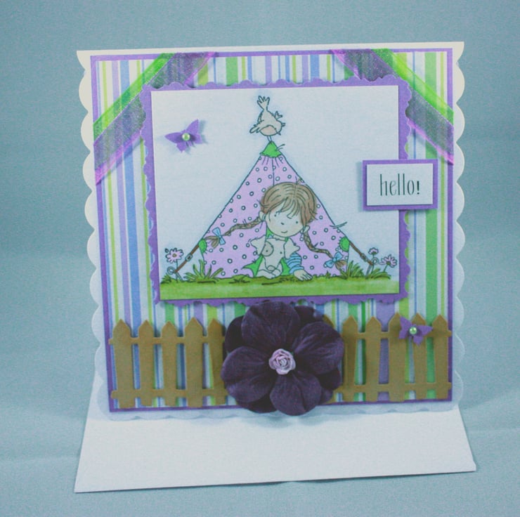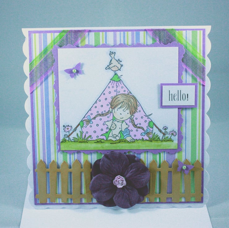 Square, scalloped card featuring a hand stamped and coloured image of a little girl and her dog popping their heads out from a tent. The image is layered onto purple card and pretty striped paper and finished with ribbons, die cut butterflies and paper flowers with a die cut picket fence finishing the card.