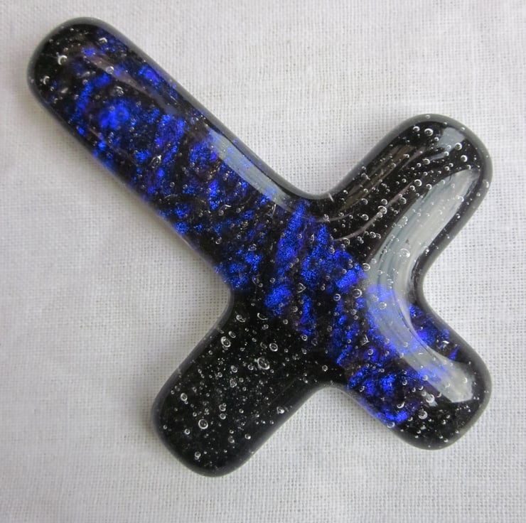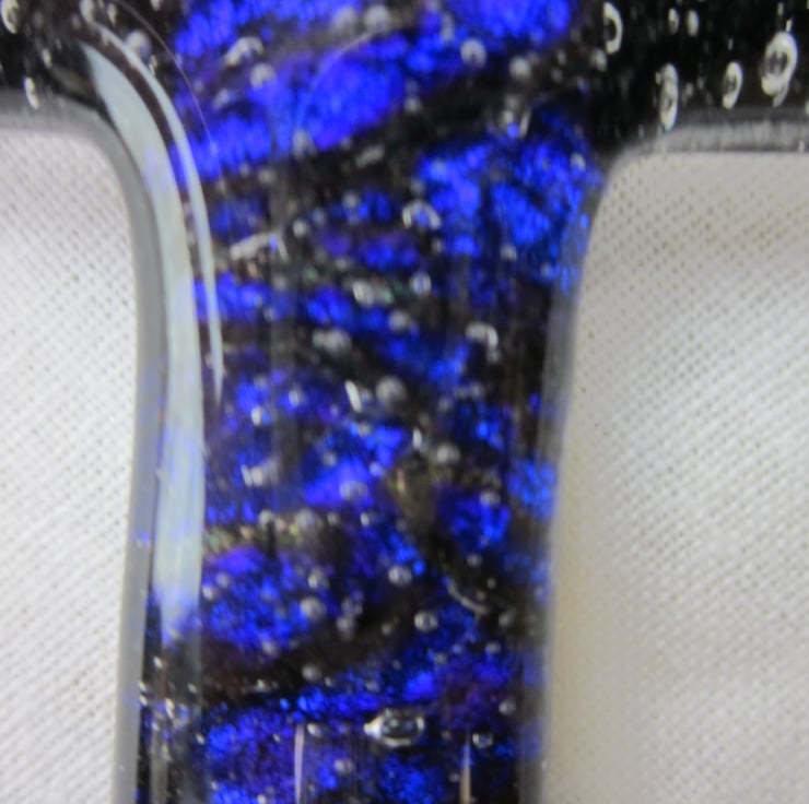 It is a stunning cross, black base with royal blue swirl dichroic down the middle, encased in clear glass with a shimmer of fine bubbles. Beautiful!
