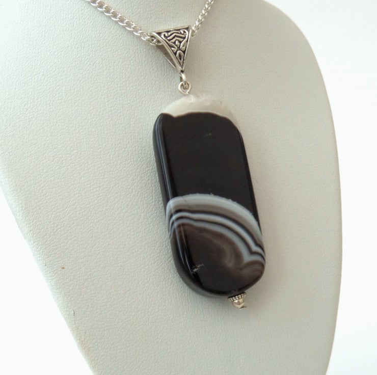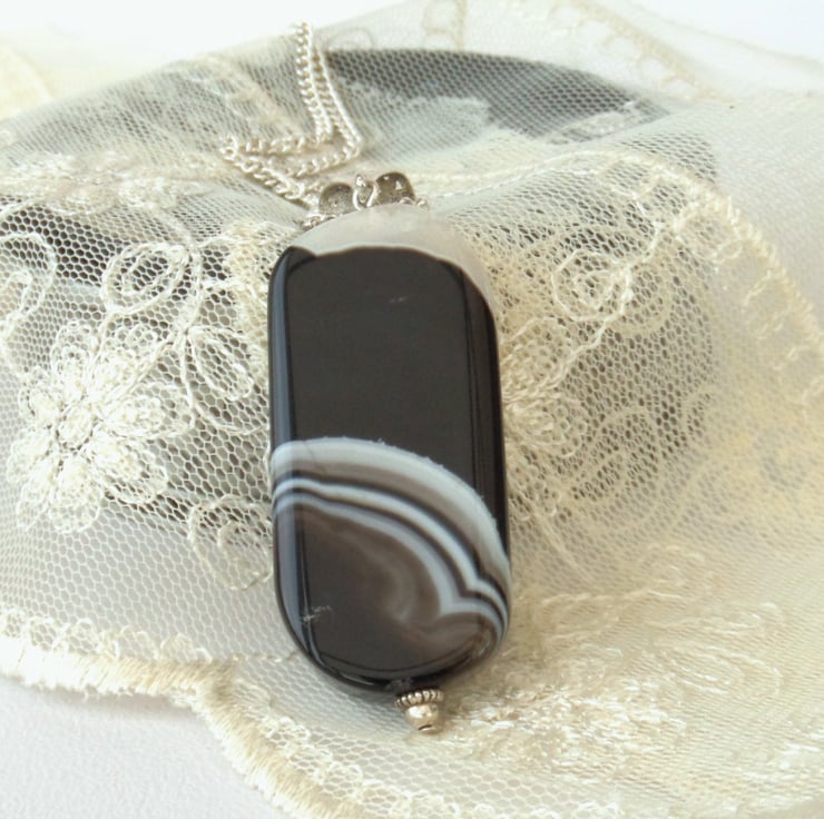 A beautiful rounded rectangular piece of agate hangs from a silver plated chain to make this unique necklace.