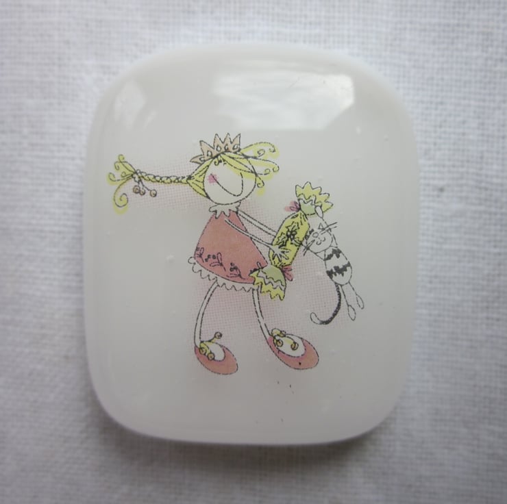 These glass cacochons were fused by me in my studio. The glass was heated up to around 800 degrees celsius in a small glass fusing kiln and then brought to annealing temperature to make it strong. When cooled, a glass decal was applied to each cab and then they were returned to the kiln for a fire polish, melting the design permanently into the glass. This whole process takes over 16 hours to complete.