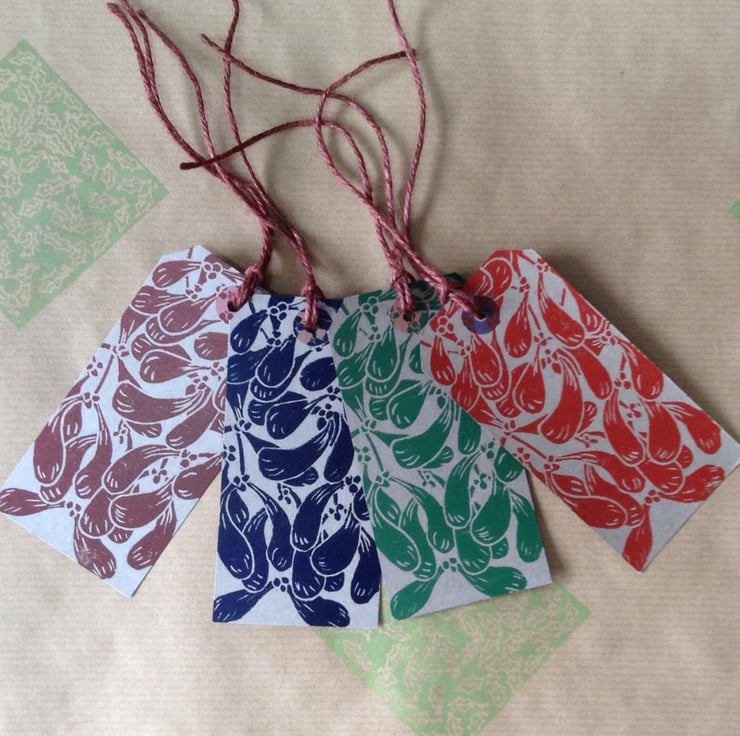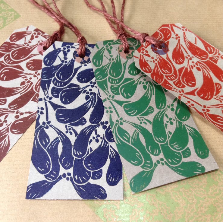 Set of four handprinted mistletoe gift tags in four gorgeous colours!