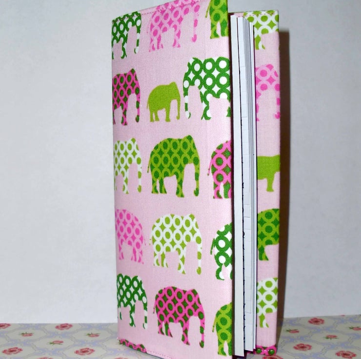 A delightful hand bag sized address book approx 7x 3.5 inches. The cover is made from a lovely elephant printed fabric, and is lined and interfaced to keep it looking good.
