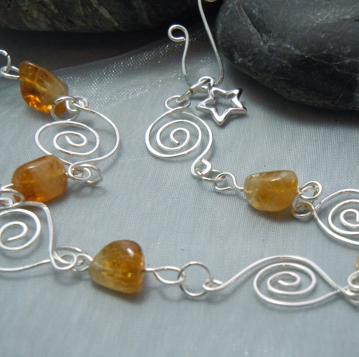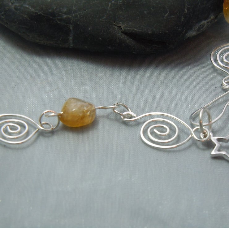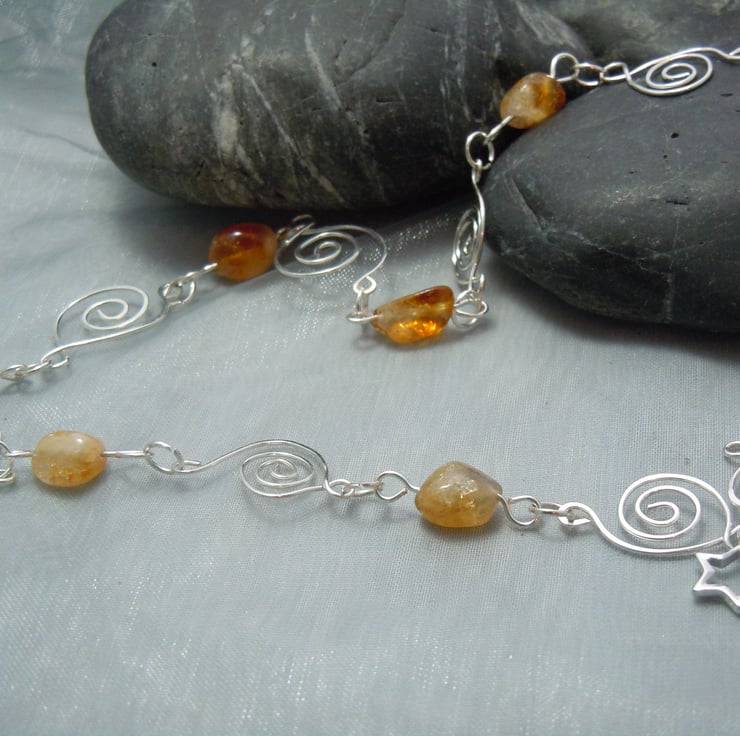 Handmade Celtic inspired silver plate wire work spirals linked with semi precious Citrine beads which creates a very light ethereal necklace with a TierraCast silver plate star charm & a silver plate handmade hook clasp. Citrine is a November birthstone.