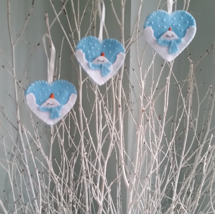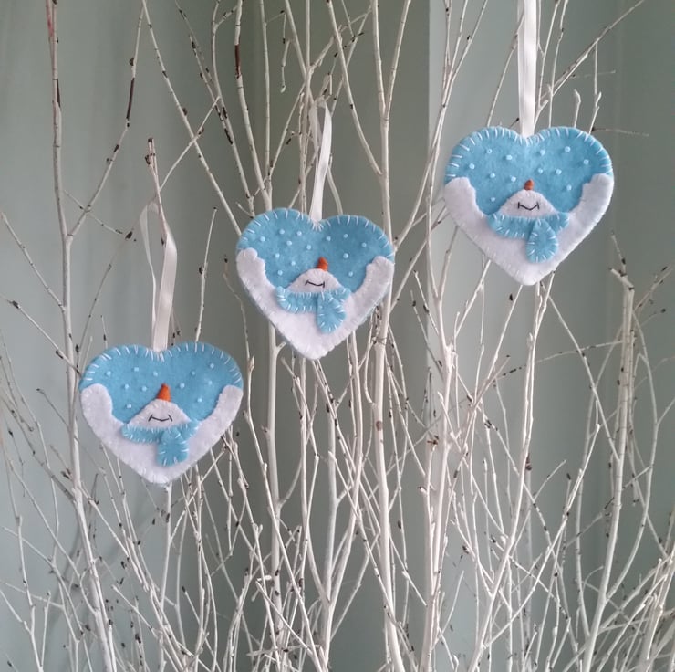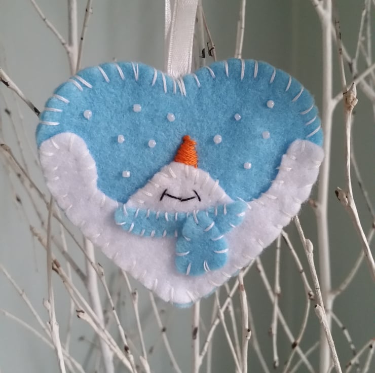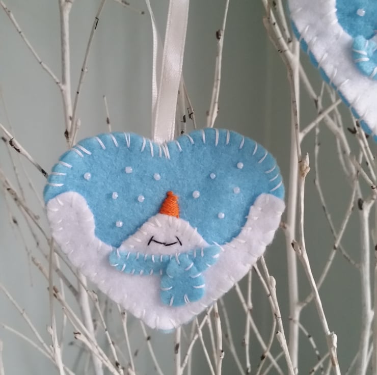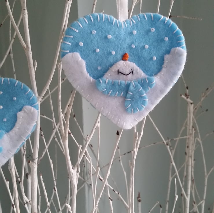 Seed beads for snow and orange thread for the nose. All hand sewn.