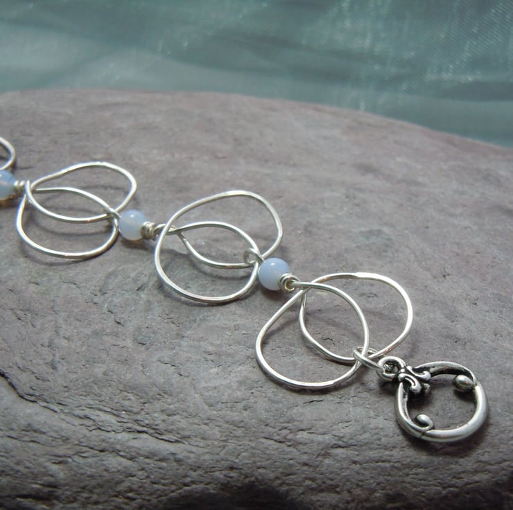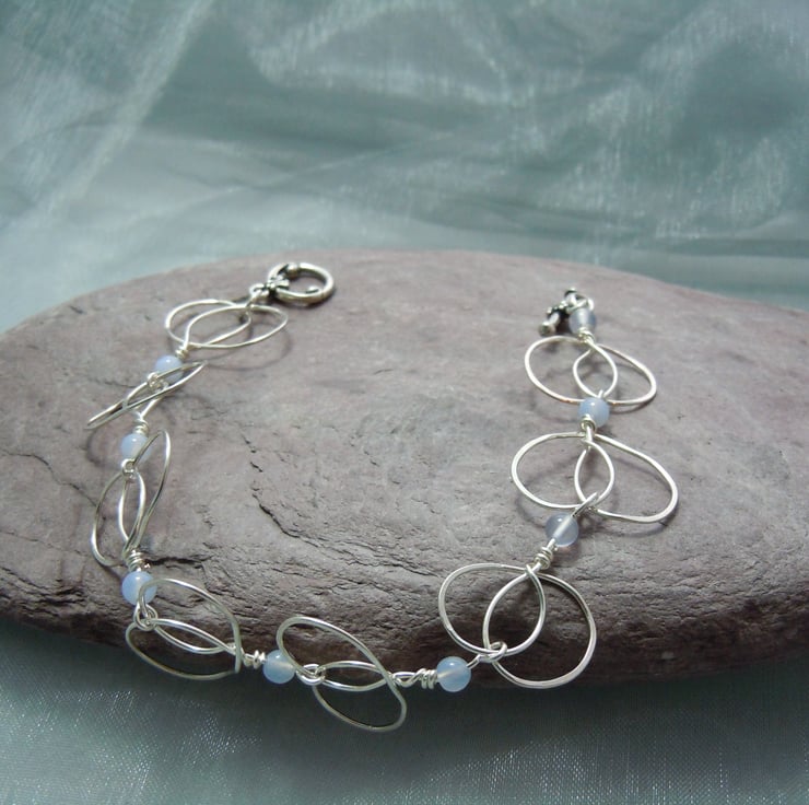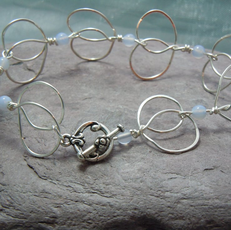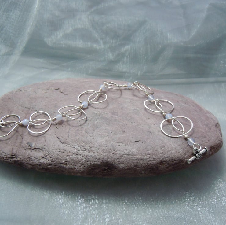 A delicate silver plated wirework bracelet interspersed with tiny Blue lace Agate semi-precious beads & finished with a Tierracast toggle clasp.