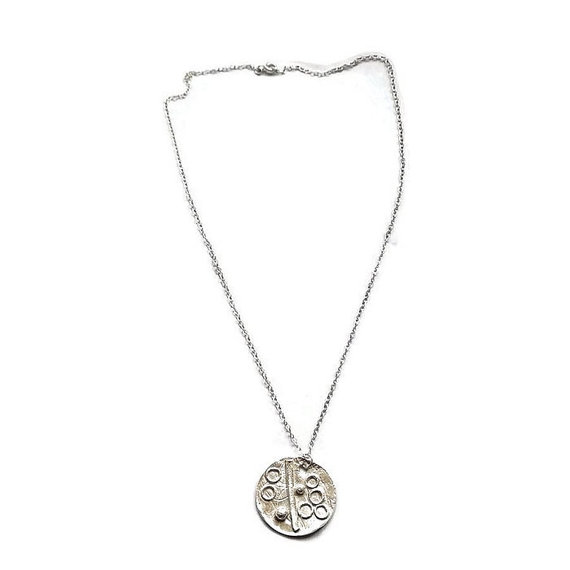 A sleek modern pendant featuring a disc cut from sterling silver which has been embossed with an abstract line pattern and embellished with sterling silver wire, hoops and granules.