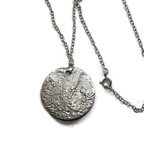 The disc is 2.1 cm in diameter and cut from 0.7mm thick sheet silver. The back has been reticulated, creating the unique texture which has rippled the disc slightly.