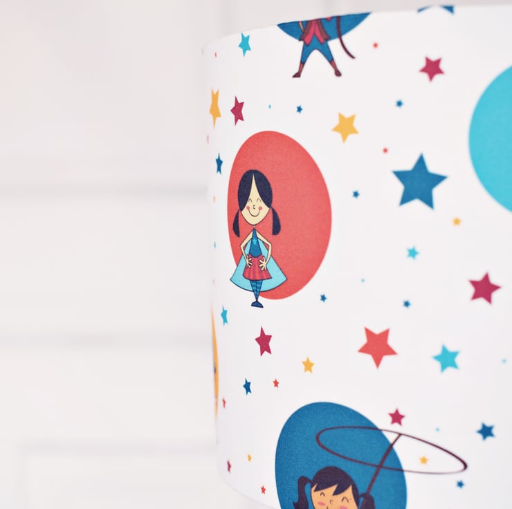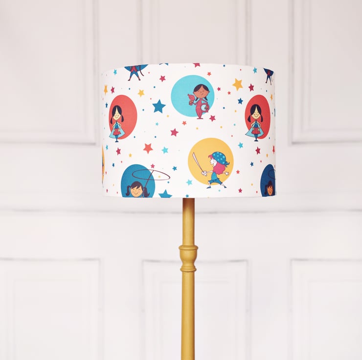 This lampshade features a fabric named Girl's Powerful Playtime designed by independent designer Tabitha Smith. The fabric features colourful circles of girls enjoying less traditional pastimes such as cowgirl, pirate, space ranger. This lampshade would be a wonderful addition to any girl's bedroom or nursery. If you would like a swatch of the fabric please send me a message.