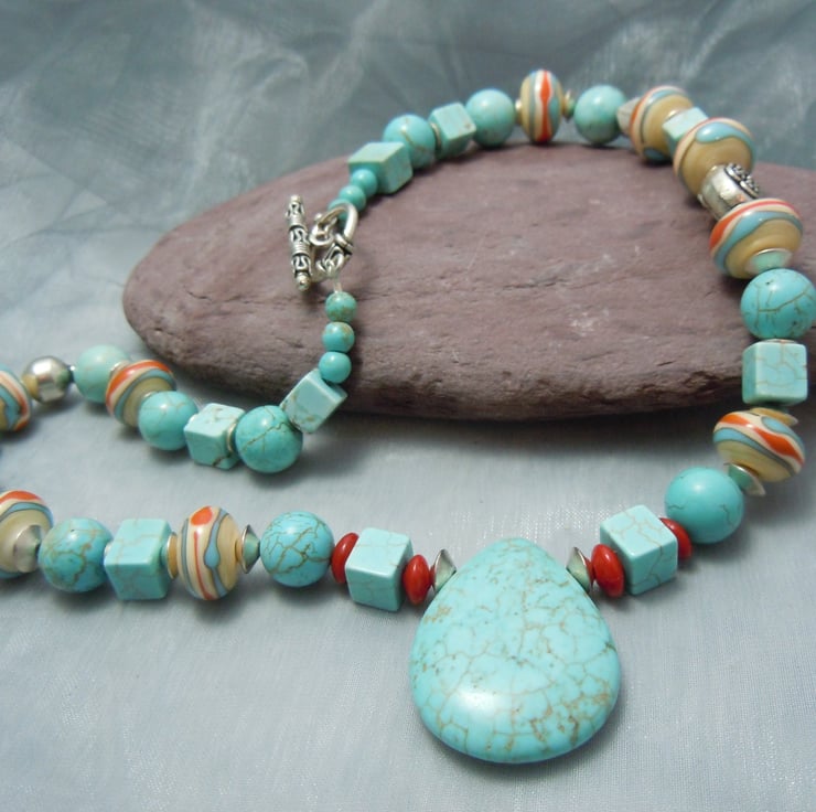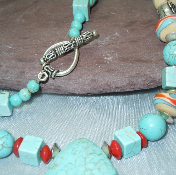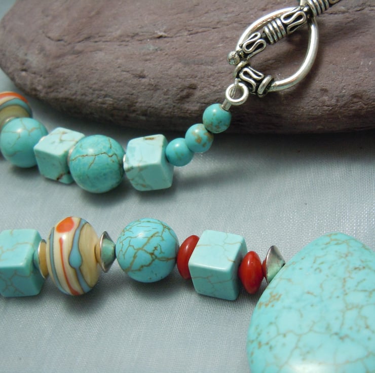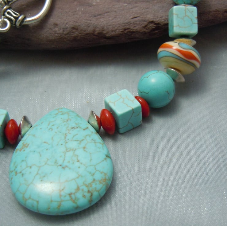 A statement necklace with lovely Lampwork glass beads & assorted Magnesite turquoise beads accented with silver plate beads & red glass beads. This chunky necklace has a large focus teardrop Magnesite turquoise bead & is finished with a silver plate toggle clasp.