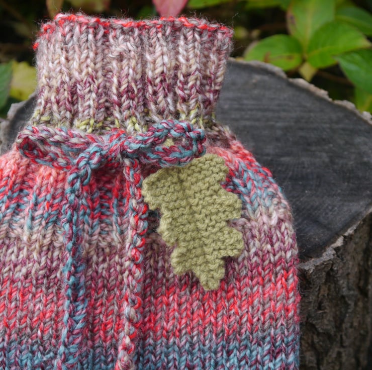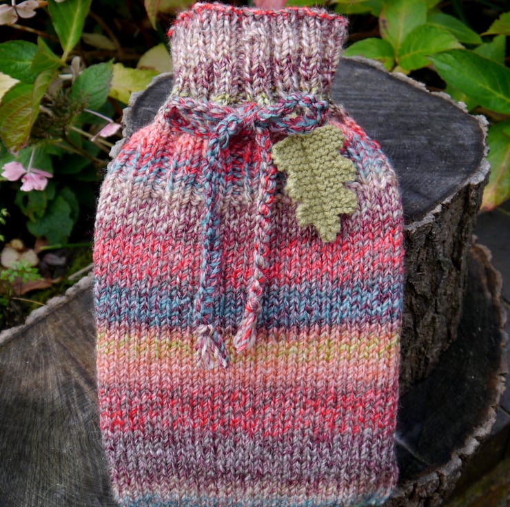 A lovely stripey hand knitted hot water bottle cover with a knitted oak leaf attached.Top opening with a drawstring tie. Made using a lovely marbled chunky wool which is machine washable.