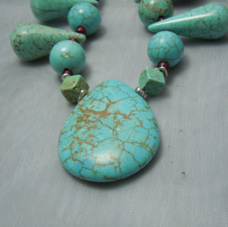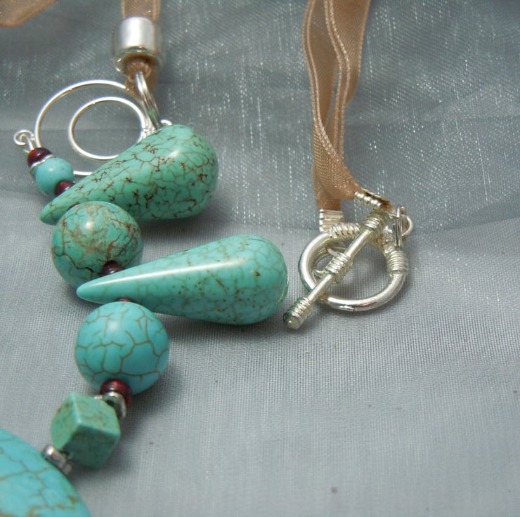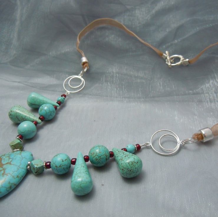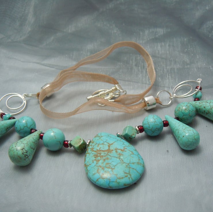 A collection of interesting shaped Turquoise beads accented with red glass seed beads combined with a silver plated double rings & ribbon finished with a silver plated toggle clasp.