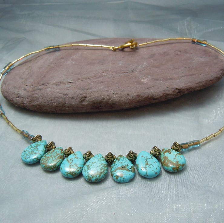 A necklace of lovely Magnesite dyed turquoise teardrop beads with gold plate accent beads & glass seed & bugle beads finished with a gold plate toggle clasp.