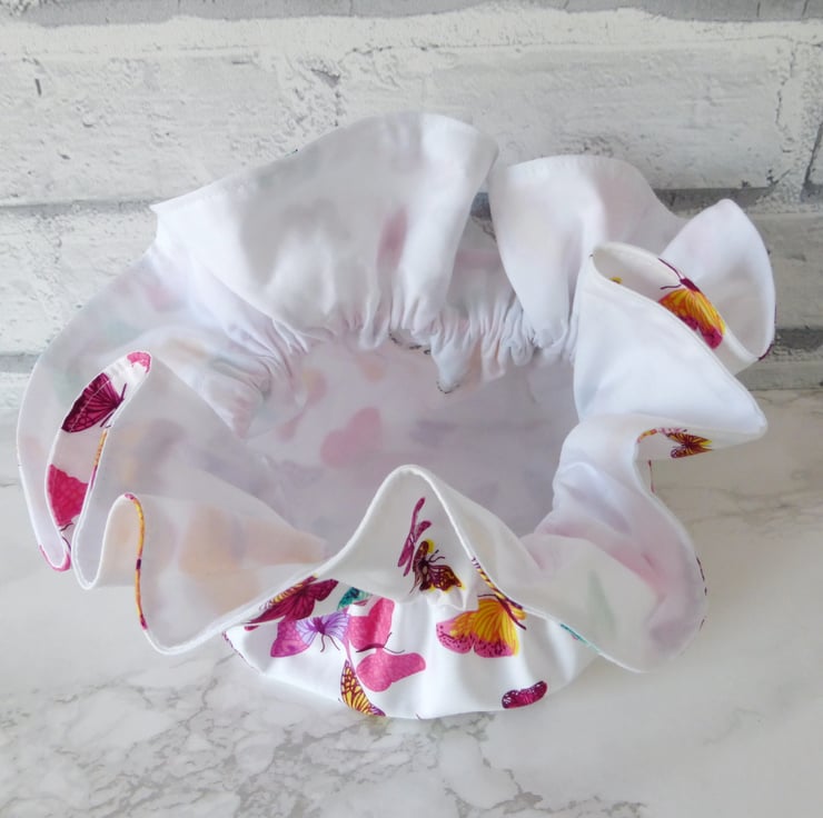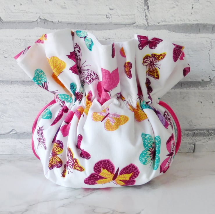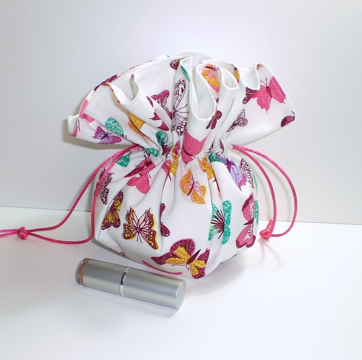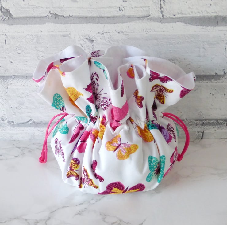 This is a small dolly bag made using a complete circle of pretty cotton print fabric with multi colour butterflies on a white background. It has a white cotton lining and pulls tight with a pink double drawstring.