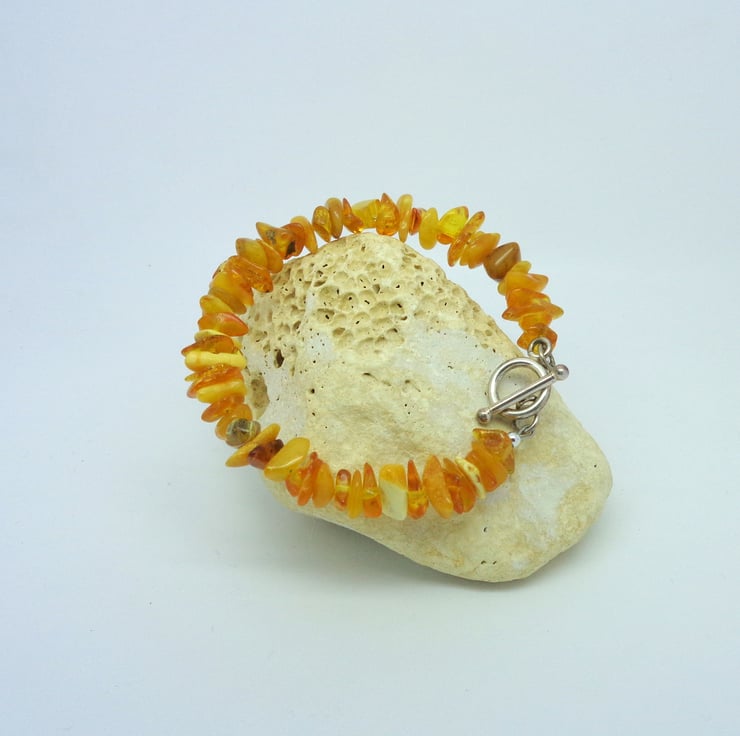 Simple & elegant - and such a glorious, rich mix of colours. Genuine Baltic amber, sourced for me by a friend from her home country. These beautiful chips are set on a circle of memory wire with a silver-plated toggle clasp.
