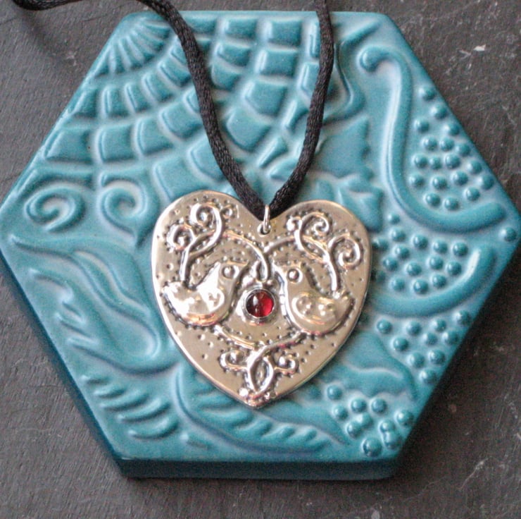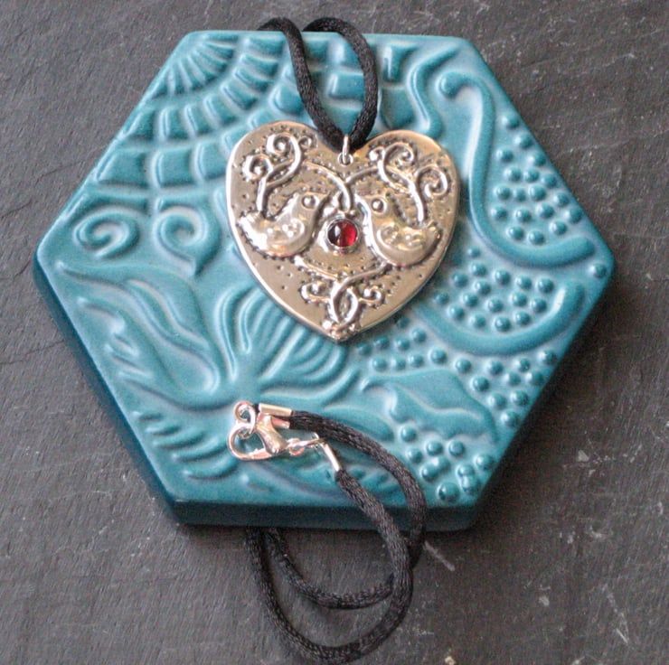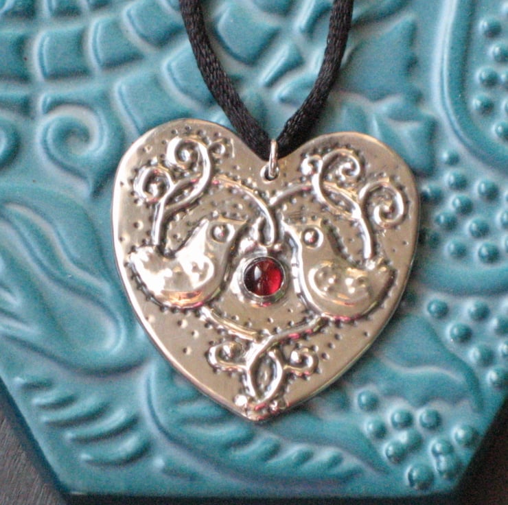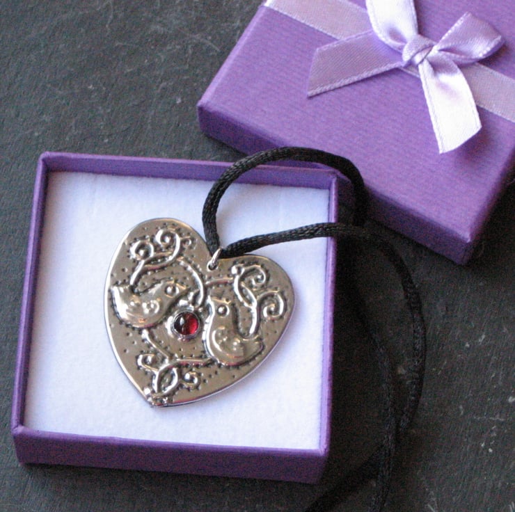 Inspired by The StrawberryThief design by William Morris, I have made this pendant by hand in the Arts and Crafts tradition using lead-free sheet pewter. The heart measures 40mm across and the piece has been set with a glowing red garnet cabochon. It is suspended from a black silky cord approximately 45cm long and fastening with a lobster clasp (please let me know if you would like a different length).Treat yourself to something striking to wear at those Christmas gatherings. Also a perfect gift for a mum,sister or girlfriend. Gift boxed.