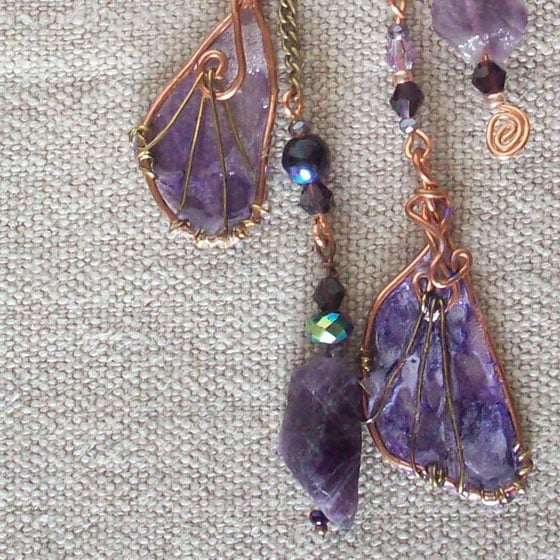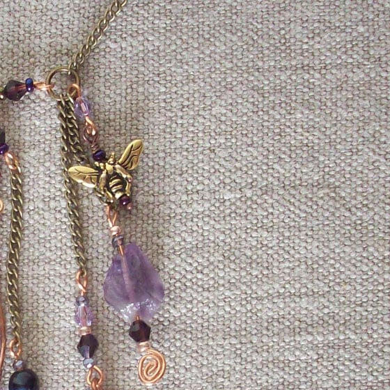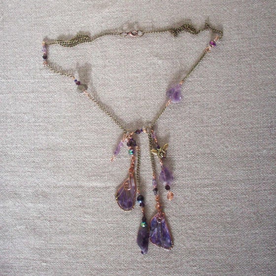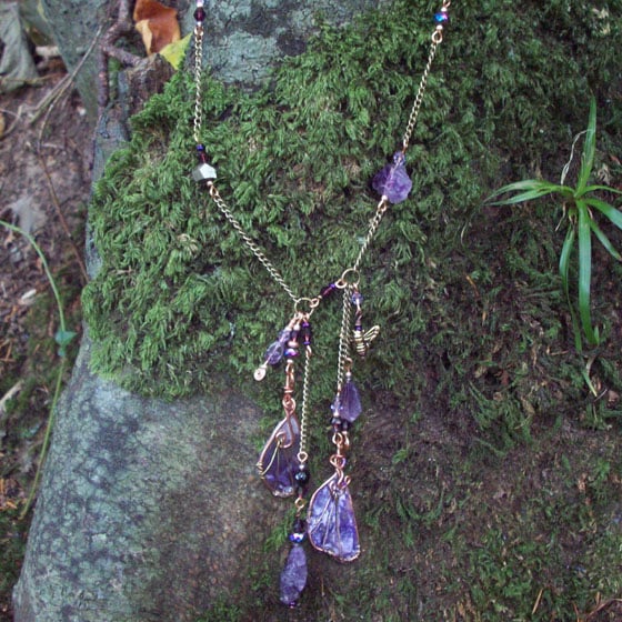 Regal purple chunks of amethyst and old gold baroque faceted golden haematite intersperse on chain, with a bee charm, resin fairy wings painted in pearlised purple and more gemstones cascading down. The lead-in time for this order may vary from 1 - 4 weeks as I may have one made up but in another location. Contact me for details. Comes to you in an organza bag. Postage is Special Delivery for the insurance cover. Thanks for looking and for supporting hand-made!