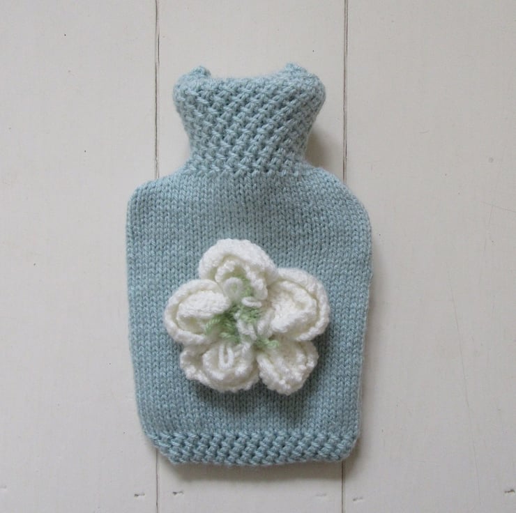 A hand knitted hot water bottle cover knitted in a duck egg blue blue coloured yarn. The neck and base are knitted in a lovely lacy stitch, giving a delicate texture, whilst the back envelope style opening has a two rows of lace stitch and is then finished with a knitted scallop edging. The front has a plain panel and is decorated with a beautifully knitted large ivory coloured peony flower. The centre of the peony has ivory and pale green stamens. A perfect size for nestling in the small of your back, or tucking up your jumper!!
