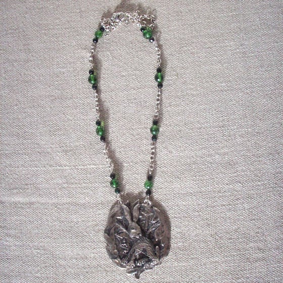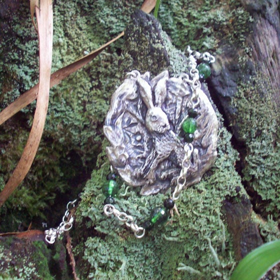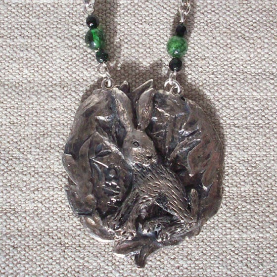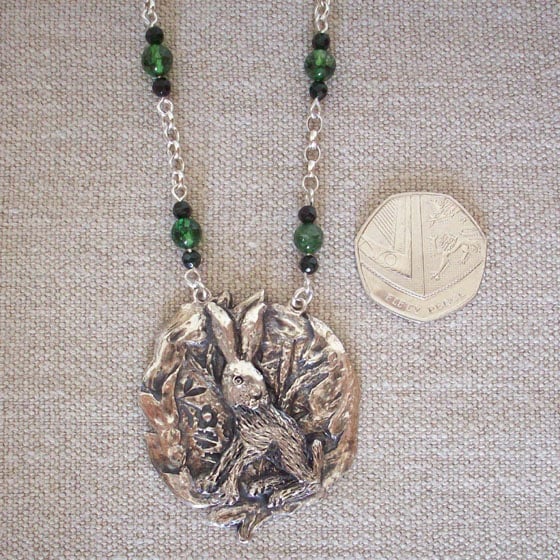 I have modelled the Hare from William Morris's famous tapestry "The Forest" in 99% pure silver, on a background of swirling acanthus leaves and oak leaves. The hallmarked pendant is oxidised in the background for added contrast. He is strung on a silver chain interspersed with crackle effect green quartz, and green goldstone to echo the depths of the forest. The lead-in time for this order may vary from 1 - 4 weeks as I may have one made up but in another location. Contact me for details. Comes to you in a gift box. Postage is Special Delivery for the insurance cover. Thanks for looking and for supporting hand-made.