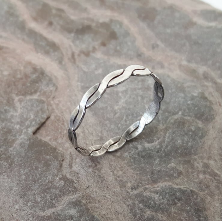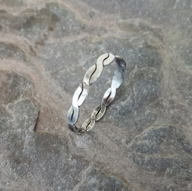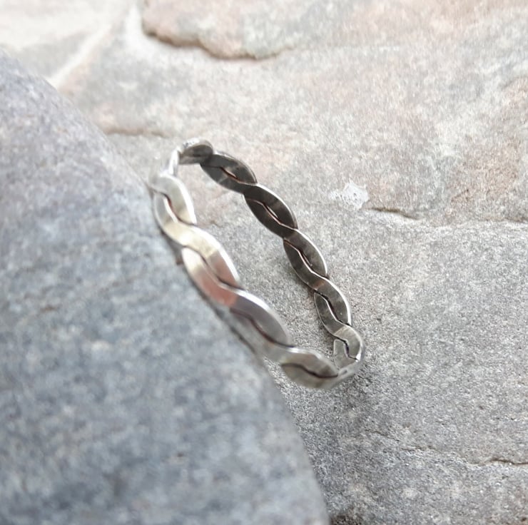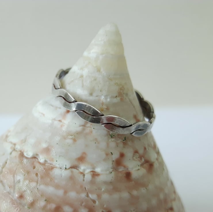 This dainty ring would make a lovely gift. It is made from two strands of 1mm sterling silver wire which have been twisted together and then passed through a rolling mill to flatten them. This creates an unusual slimline ring with scalloped edges and a slightly faceted appearance. The UK size is O1/2 so it should fit either size O or P.