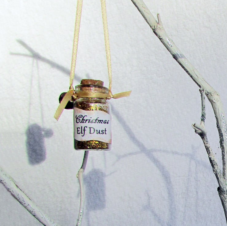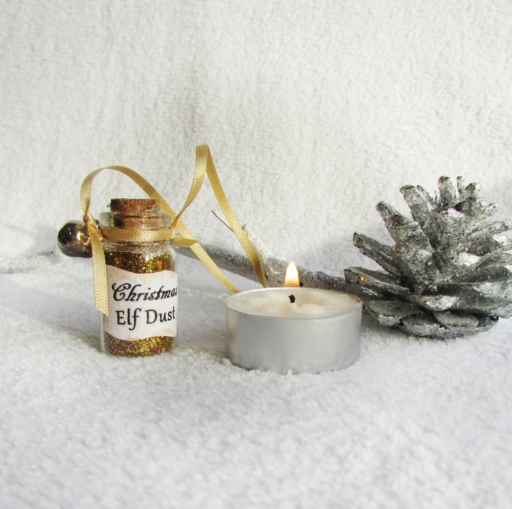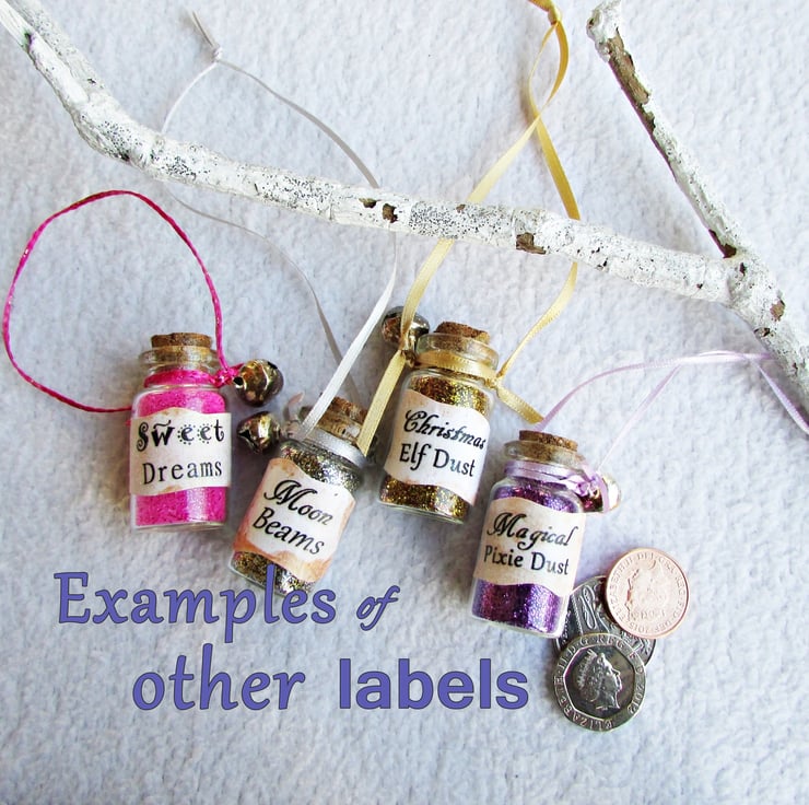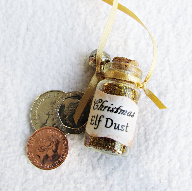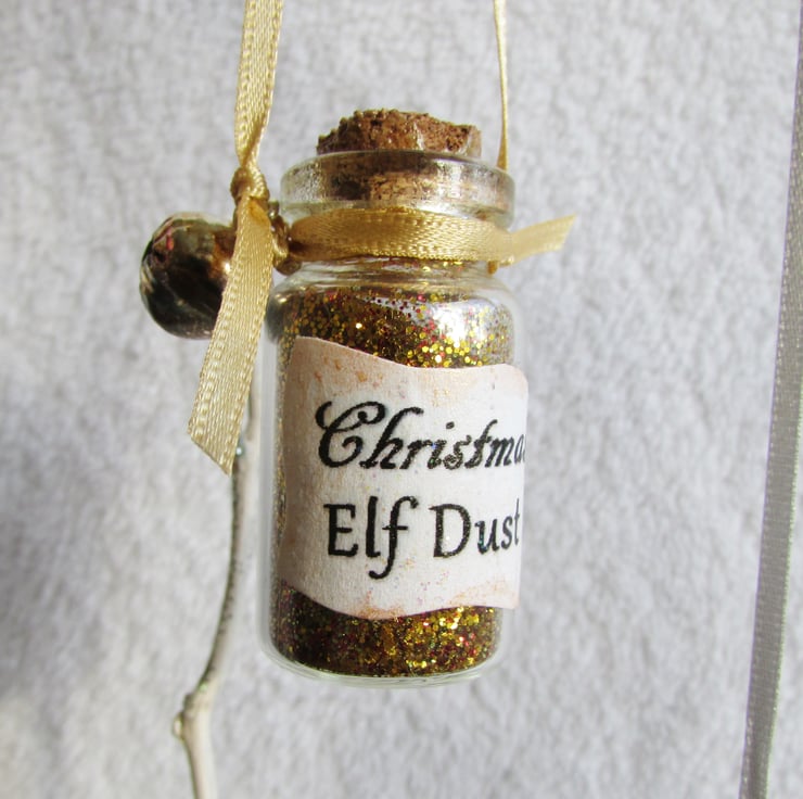 This little bottle is filled with glittering Christmas Elf Dust, it has a handmade label that has been aged and an 'antiqued' bell attached.
