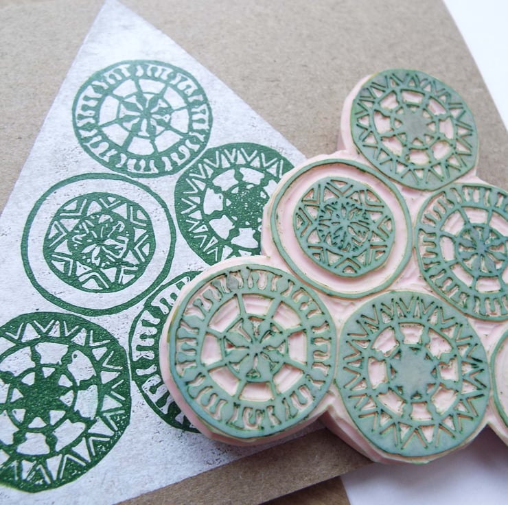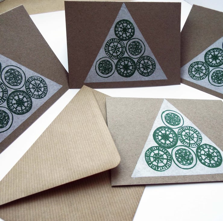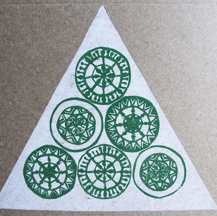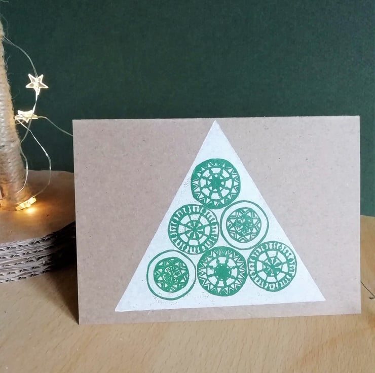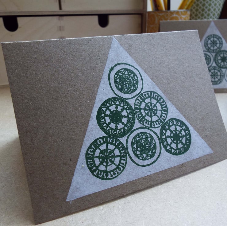 Handprinted Christmas card based on an original design by Krafty Koffeedoff. Each card has been printed with an original carving of my own design.