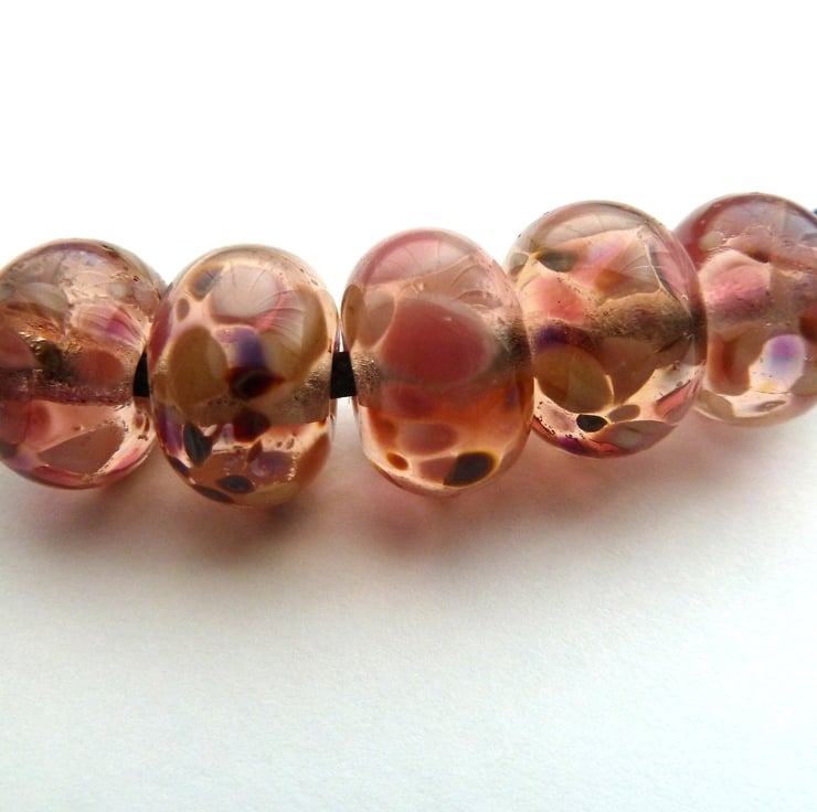 A set of 5 handmade lampwork glass beads which have been made with pink glass and rolled in frit.