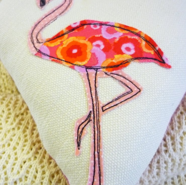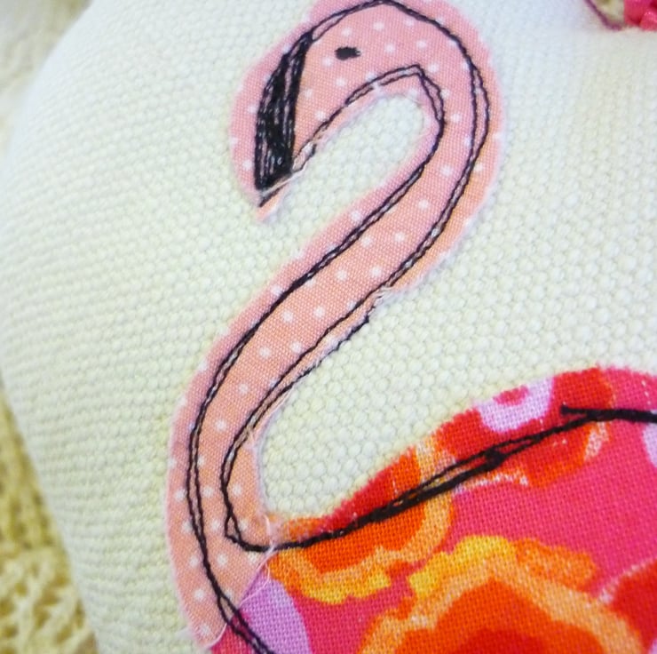 It measures 16 x 20 cm and has an applique flamingo design and hangs from hot pink cord.