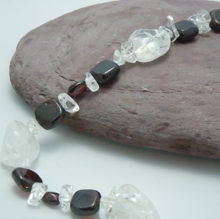 Beautiful chunks of crackled Quartz & squares & ovals of deep red Garnets creates an eye-catching piece of jewellery & finished with a chunky silver plated toggle clasp.