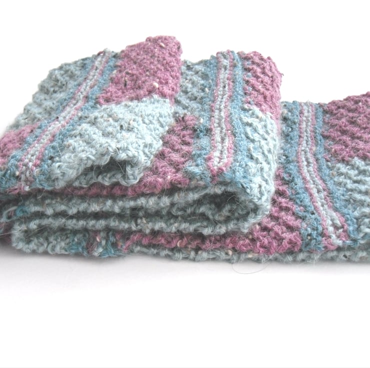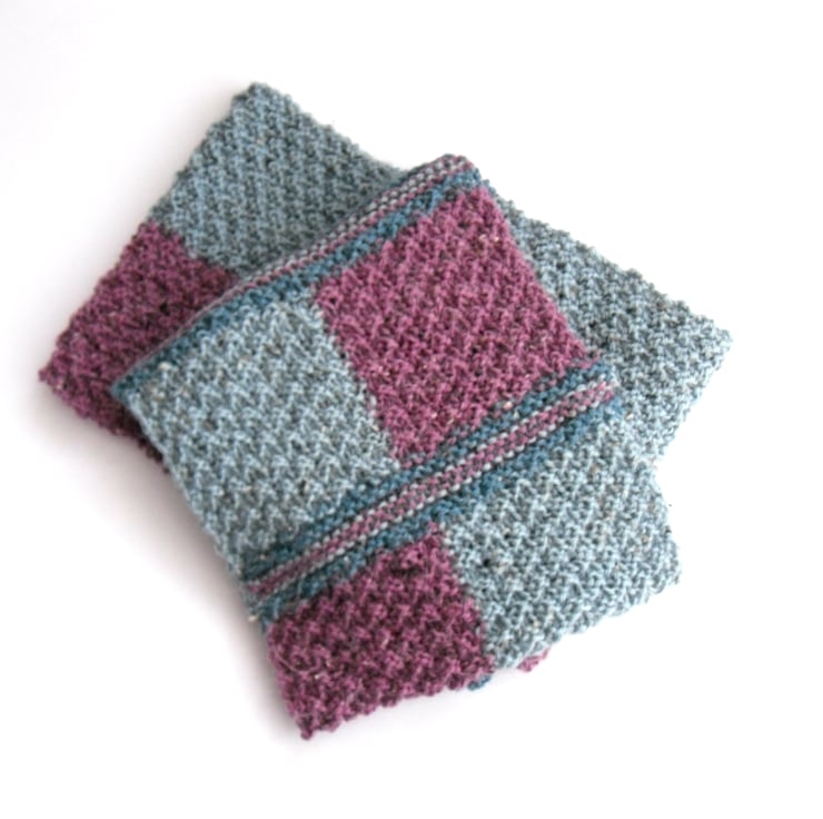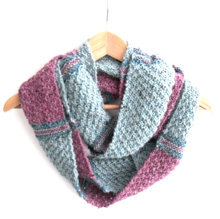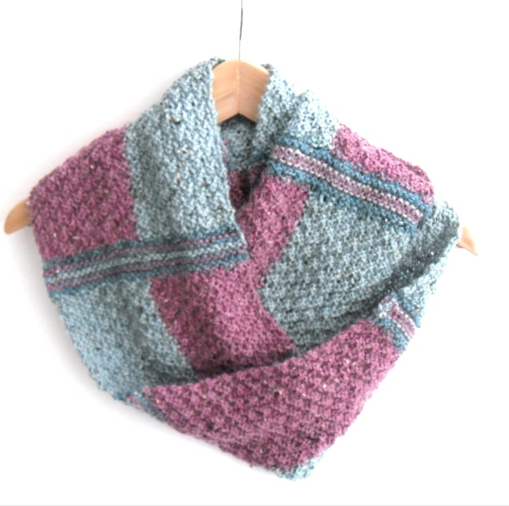 This Gorgeous soft hand knit infinity scarf mimics the Scottish tartan, knitted in beautiful heather and duck egg hues in a lovely textual knit stitch.