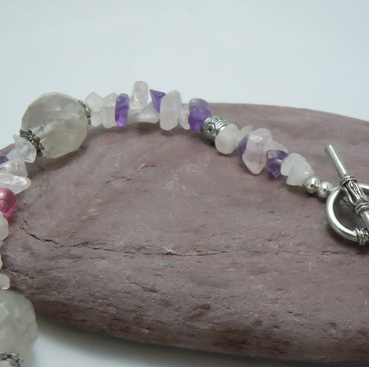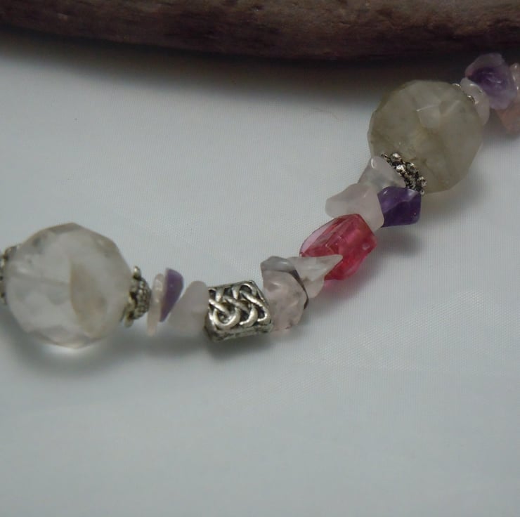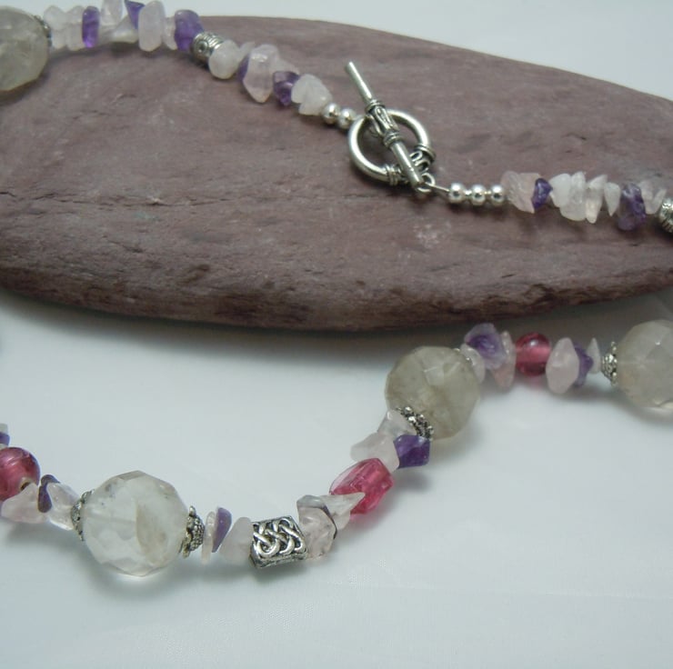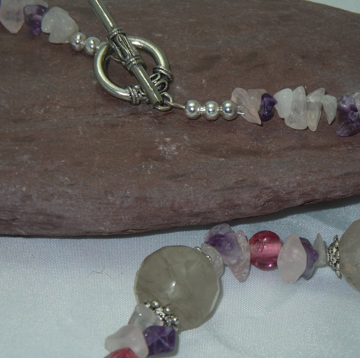 Beautiful large facetted Smoky Quartz beads interspersed with Amethyst, Rose Quartz chips & glass beads with silver plated accent beads & finished with a silver plated toggle clasp.