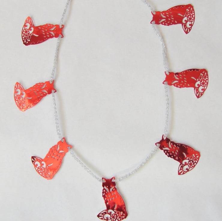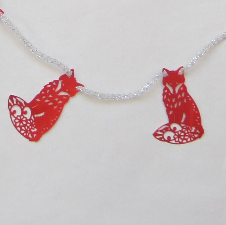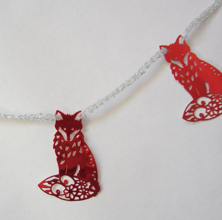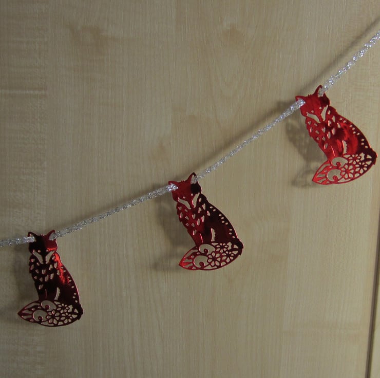 Christmas fox bunting made from red shiny card (white on reverse). There are 7 foxes each measuring 8.5 x 5.5 cm strung on glittery silver braid. The whole string measures about 1.5 metres and there is a loop at each end for hanging. Foxes can be moved to desired position.