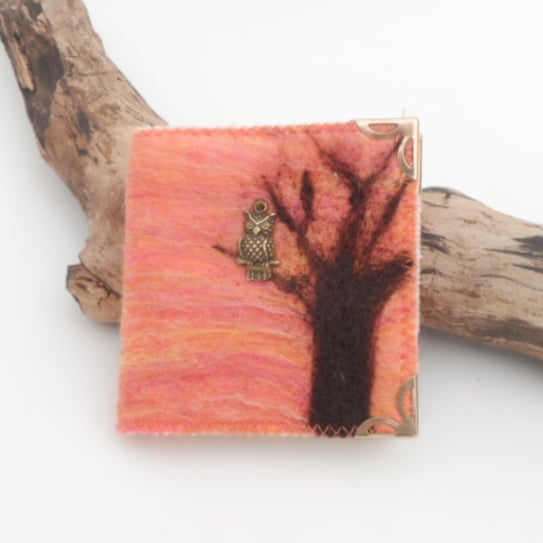 The needle case has been made from hand felted orange merino wool. It has been lined with white commercial felt with two small pockets for accessories inside the front cover and two felt pages for needles and pins. Onto the front a tree has been needle felted and an antique bronze coloured owl charm perches on a branch. The needle book has been finished with gold coloured corner protectors for extra durability.