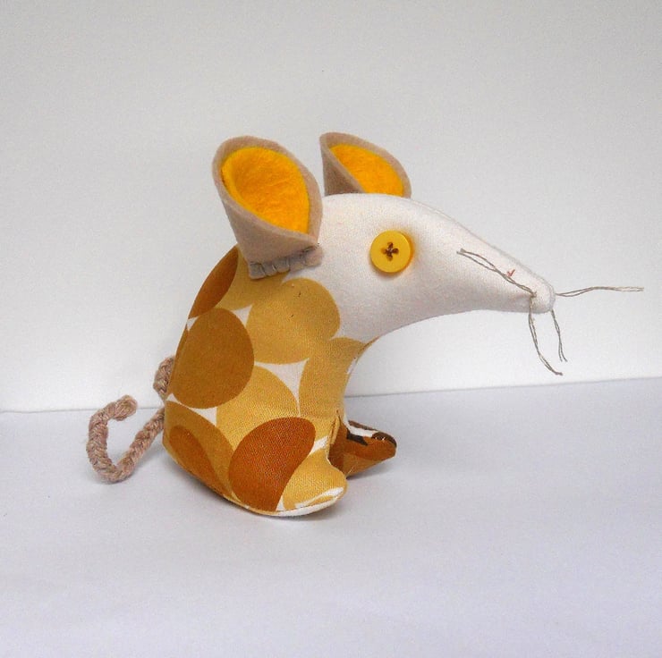Retro 'tastic Mouse mouse has button eyes, felt ears and a plaited wool tail and cotton whiskers. He is approx 10cm tall from the tips of his toes to the top of his ears and approx 11cm from his nose to his bottom.