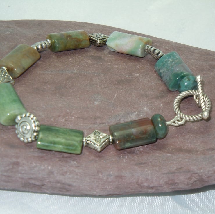 Pillows of Indian Agate with silver plate accent beads & finished with a silver plate toggle clasp.