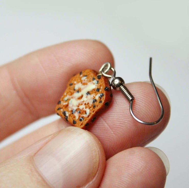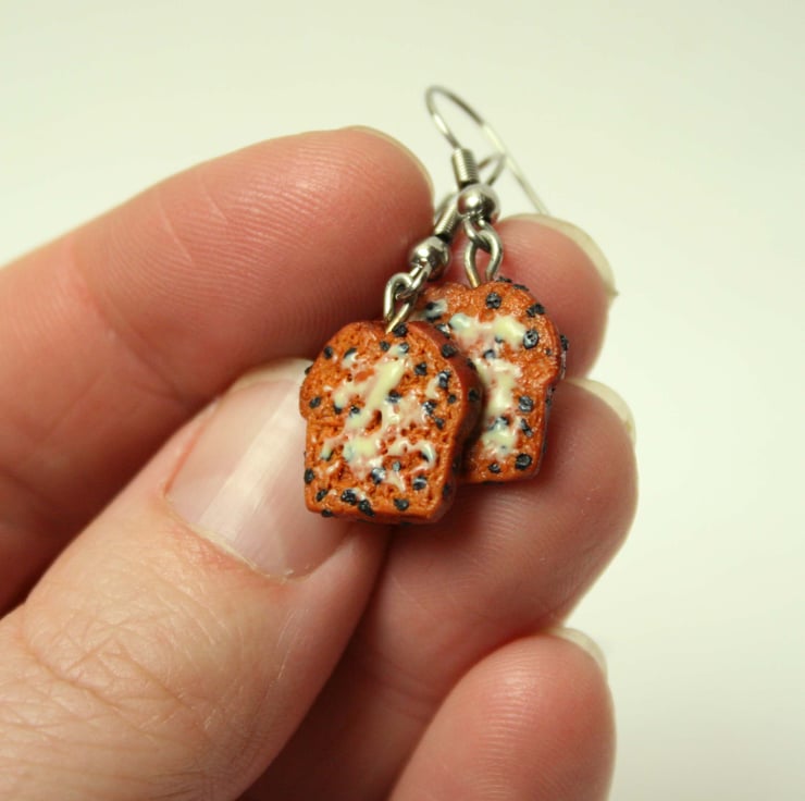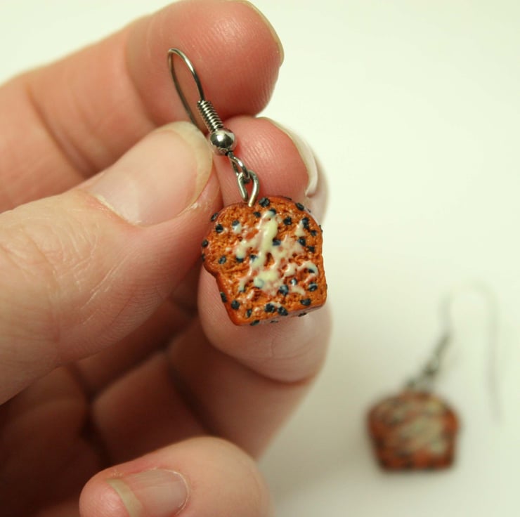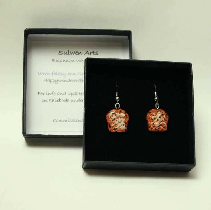 The Bara Brith slices have been shaped and sculpted by hand with great attention to detail using different coloured clay's and pastel chalks to shade, so each one is unique and will have some differences to the others. The ear wires are hypo allergenic surgical steel and they come in a lovely black jewellery gift box.